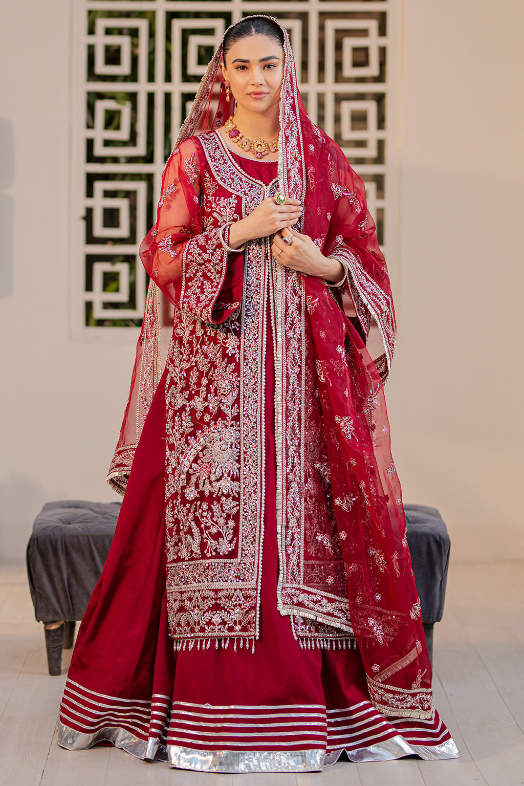 A majestic creation that exudes royal grandeur, this deep crimson red bridal ensemble is adorned with exquisite silver zari embroidery, sequins, and intricate threadwork, making it a true masterpiece of craftsmanship. The long kameez features sheer sleeves with detailed embellishments and ornate borders, paired with a voluminous lehenga that adds a regal flair. The heavily embroidered dupatta, edged with shimmering details, completes the look with timeless elegance. Perfect for bridal wear or wedding festivities, this attire symbolizes tradition with a touch of modern sophistication.