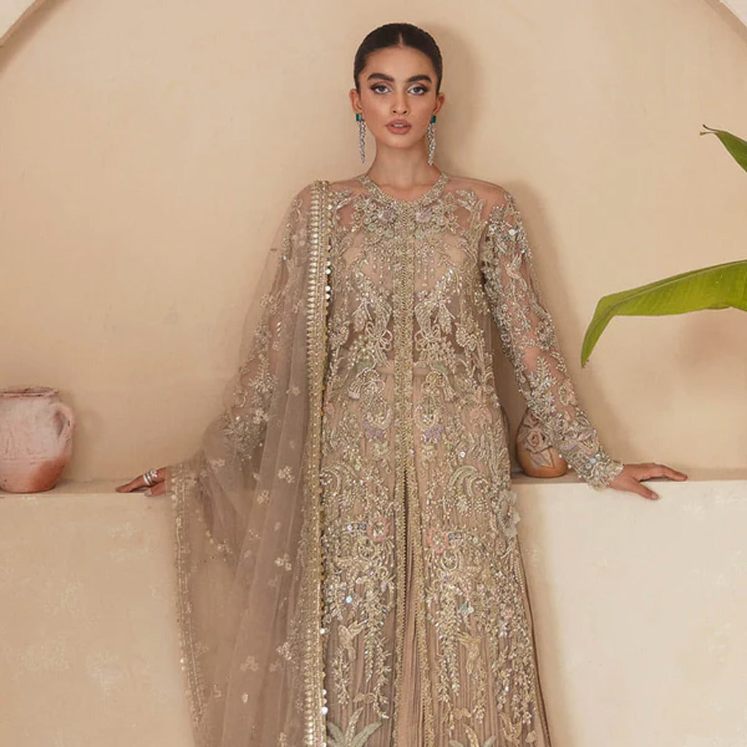 • Dahlia is a modern technique masterpiece essayed in dull gold & skin shades curating an enchanted bridal piece. A mesmerizing net gown beautified with multi-hued pastel shaded work ornamented with gangajamni with sheesha details further fused with dabka and katdana work. A ravishing net dupatta modified with sequins laces and striking raw silk crushed pants adorned with organza borders makes it a statement attire for a perfect wedding day.