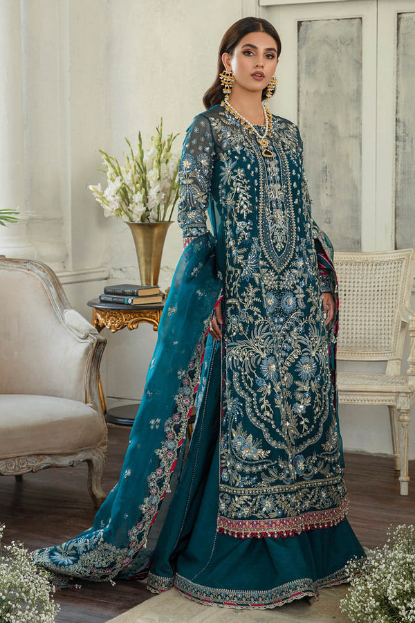 Diaanii is a gloriously curated silhouette serving festive fashion celestially with its appealing teal blue color and glinting adornments. An organza shirt and dupatta embedded with Fuschia pink hints and details of gota, crystals further fused with pearls and handwork details. Glistening silk pants are paired with it completing a quintessential festive look.