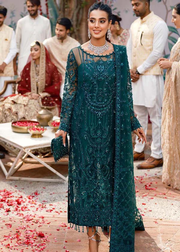 This rich emerald canvas is layered in fully net embroidered shirt. Ornamented with an artsy blend of ethnic and hand embellishments with tone of green flashy sequins detailing with richly embellished border. Richly embellished border adds a touch of luxe to entire look of this fit.