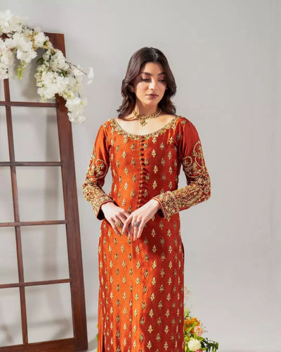 Turn heads in this rich rust-toned embroidered suit, crafted with intricate golden threadwork on the sleeves and adorned with a matching dupatta. The elegant straight-cut silhouette blends tradition with modern charm, making it a perfect pick for festive gatherings, weddings, and formal occasions.